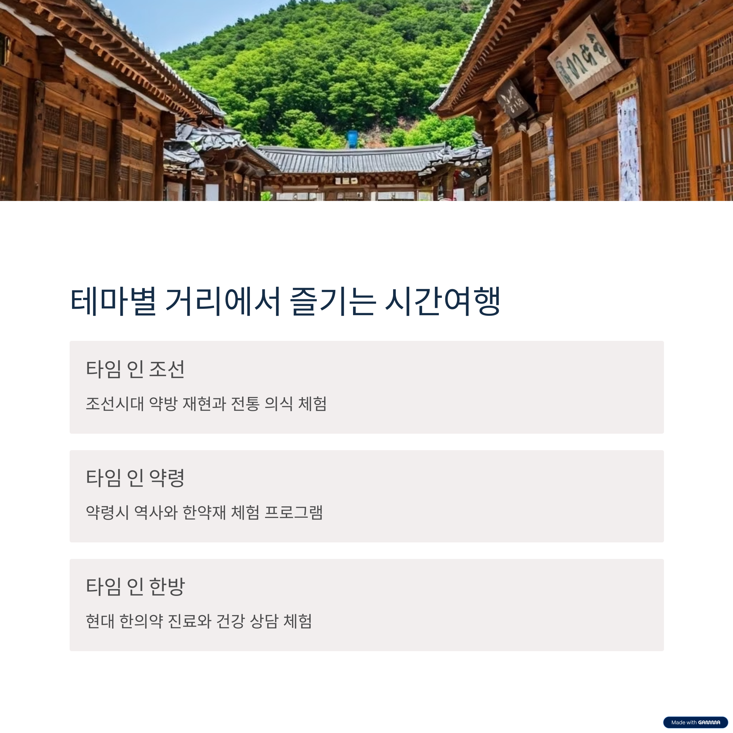 한국 전통의학(한방)의 과거와 현재를 동시에 체험할 수 있는 특별한 무대를 제공합니다.