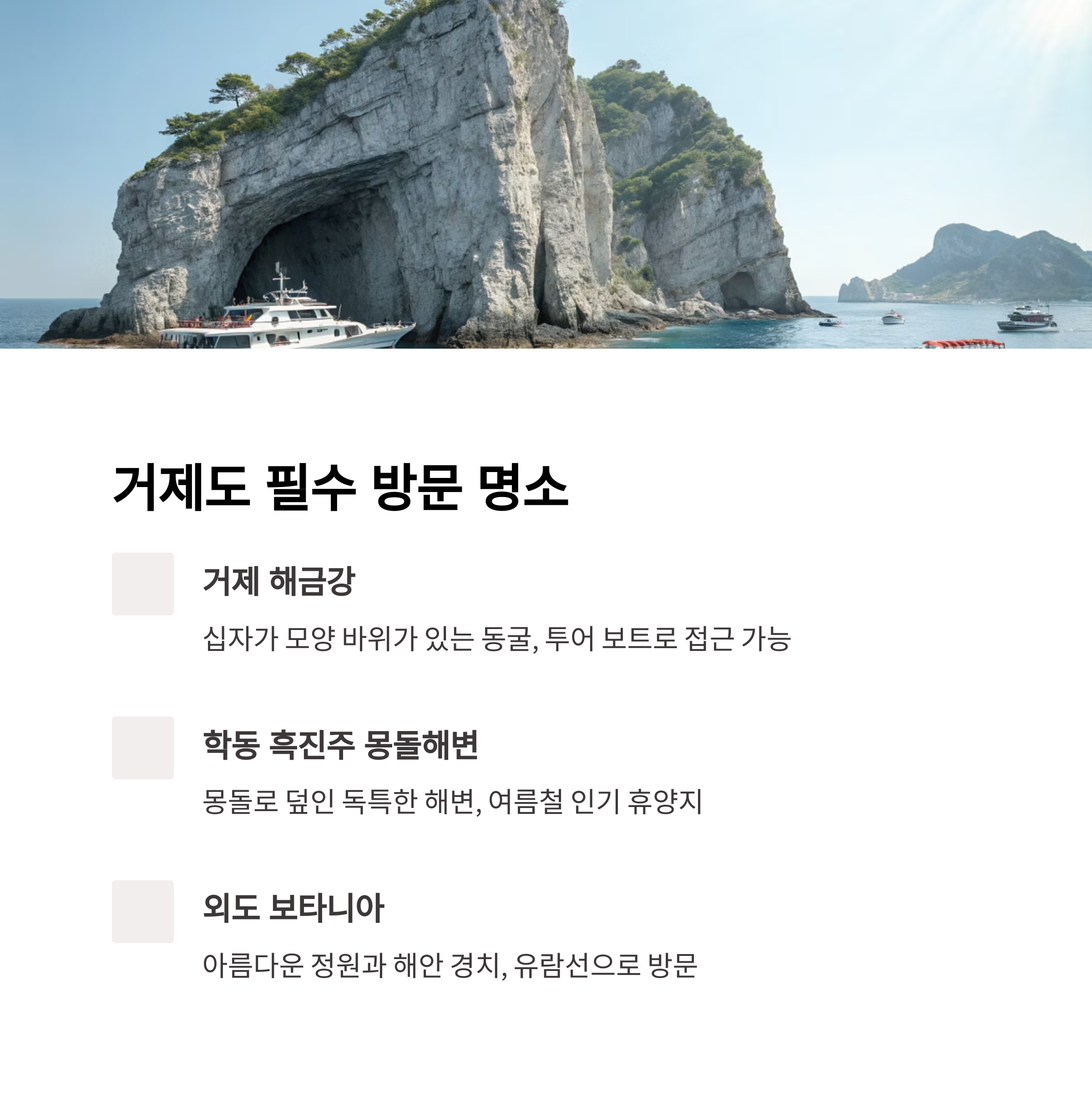 외도 보타니아와 거제 해금강 같은 자연 명소는 유람선을 타고 감상할 수 있어 특별한 경험을 선사합니다.