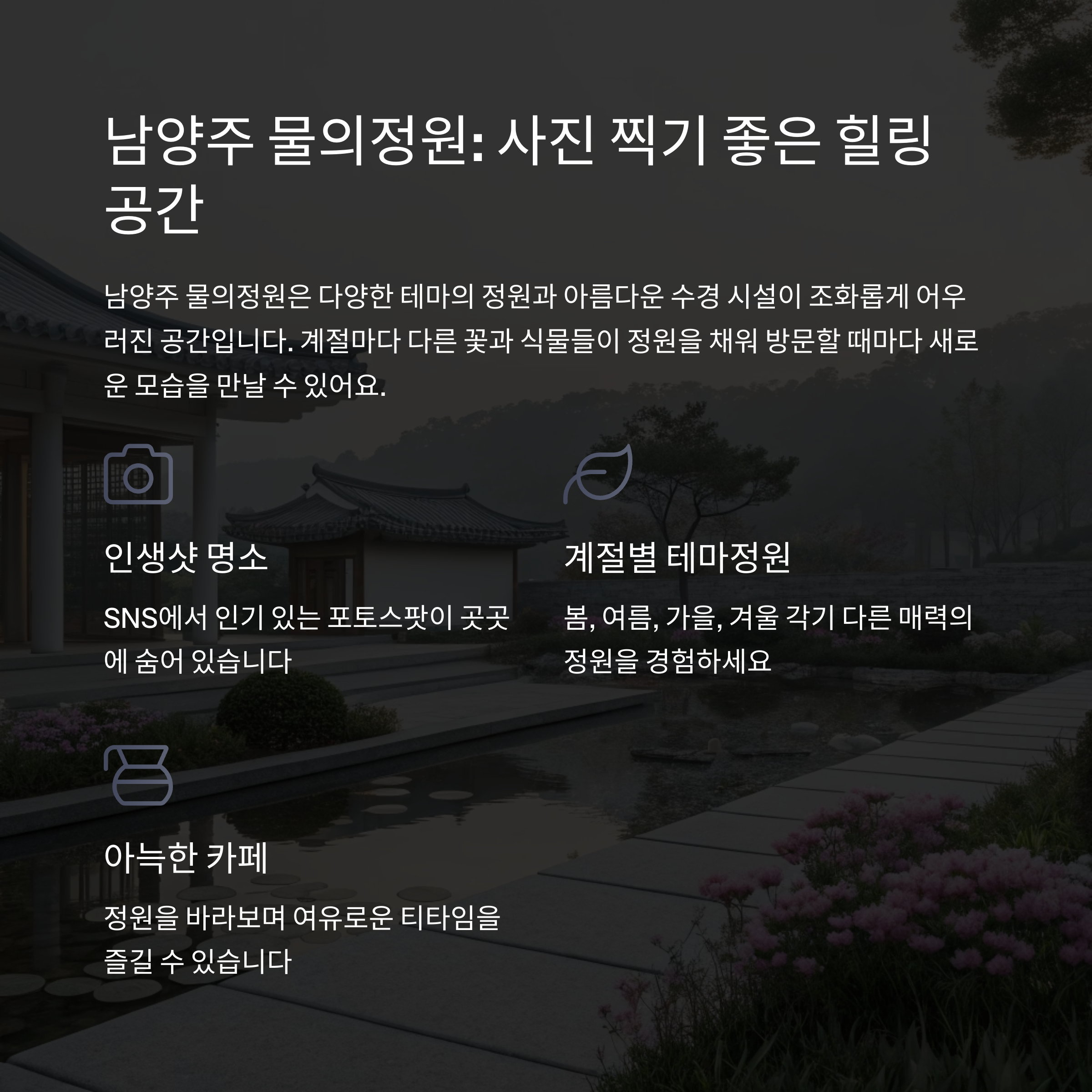 남양주 물의정원처럼 가까운 곳에서 자연을 만끽할 수 있는 코스는 시간 절약과 힐링을 동시에 제공합니다.