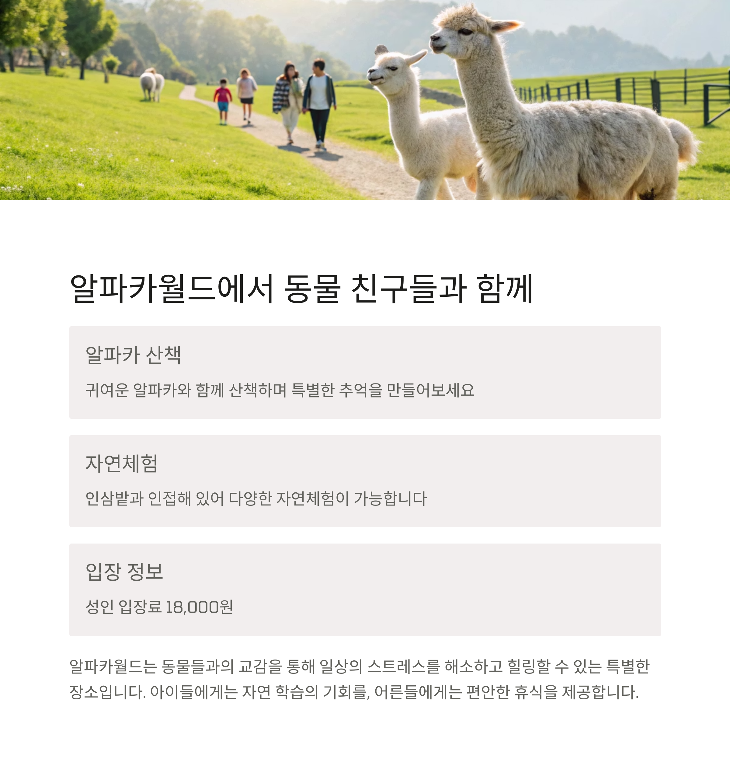 | 알파카월드 | 가족과 함께 동물 체험, 귀여운 알파카와의 산책 |