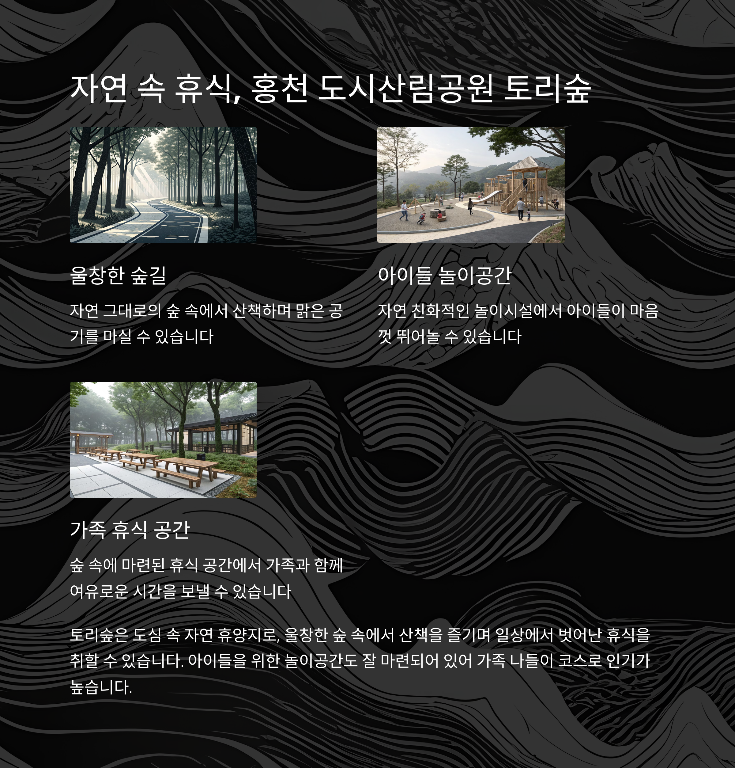 | 홍천 도시산림공원 토리숲 | 울창한 자연 속 가족 산책 및 놀이 공간 |