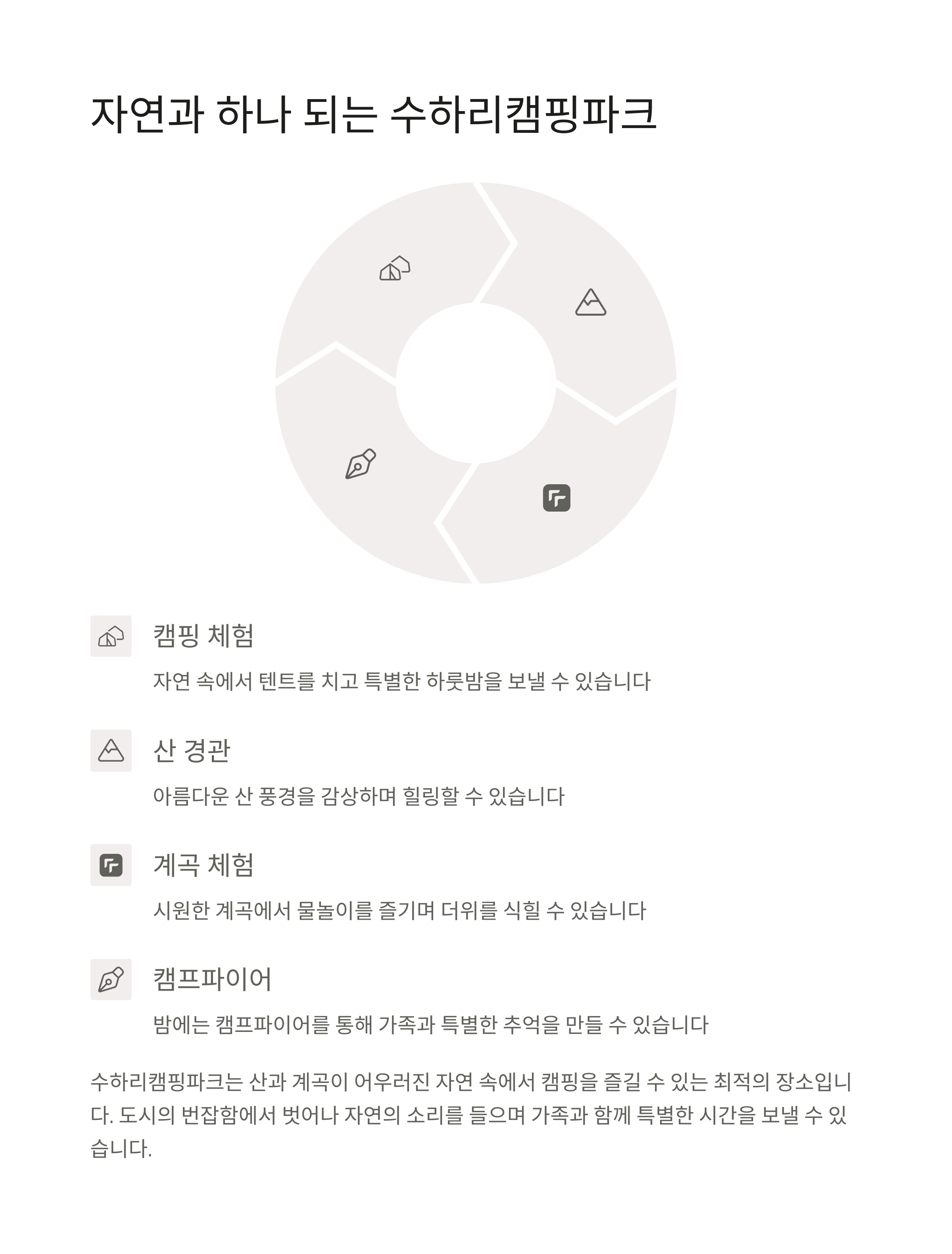 자연과의 교감을 중심으로, 다양한 체험과 활동을 통해 특별한 추억을 만들 수 있습니다.