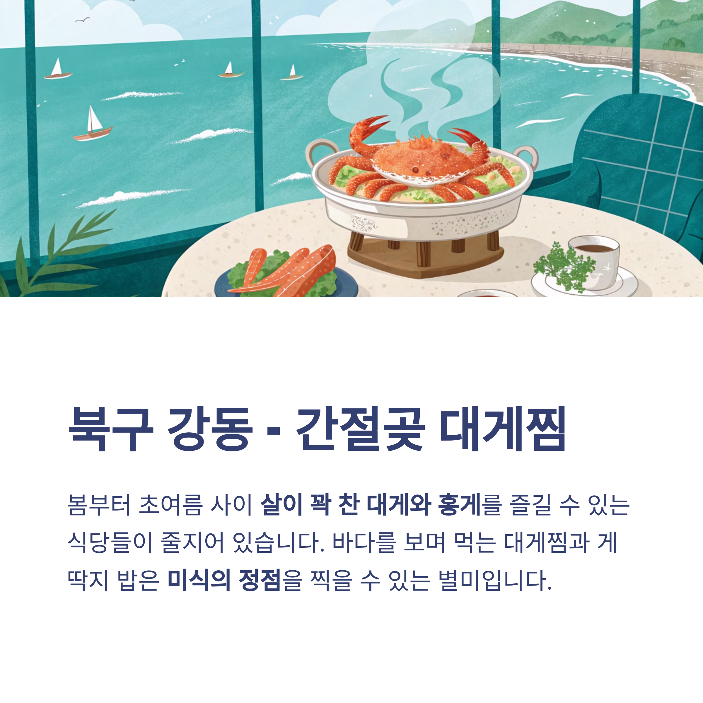 바다를 보며 먹는 대게찜과 게딱지 밥은 이 지역에서만 누릴 수 있는 별미입니다.